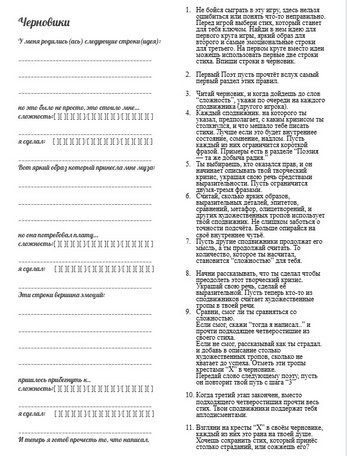 Ваши товарищи за столом расскажут с какой напастью вы столкнулись при попытке облечь в слова свои мысли и эмоции. Сподвижники опишут ваш творческий кризис максимально выразительно. Вы должны ответить, что вы делали чтобы продолжать писать, используя не меньше ярких образов, выразительных деталей, эпитетов, сравнений, метафор, олицетворений, и других художественных тропов.