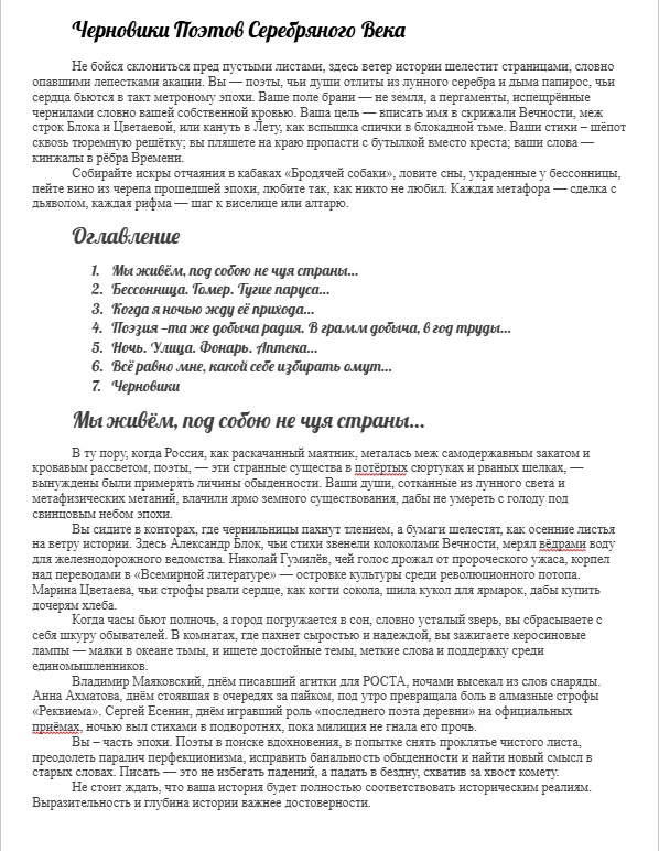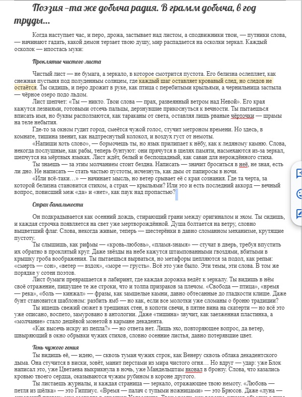Не бойтесь склониться пред пустыми листами, здесь ветер истории шелестит страницами, словно опавшими лепестками акации. Вы — поэты, чьи души отлиты из лунного серебра и дыма папирос, чьи сердца бьются в такт метроному эпохи. Ваше поле брани — не земля, а пергаменты, испещрённые чернилами словно вашей собственной кровью. Ваша цель — вписать имя в скрижали Вечности, меж строк Блока и Цветаевой, или кануть в Лету, как вспышка спички в блокадной тьме. Ваши стихи – шёпот сквозь тюремную решётку; вы пляшете на краю пропасти с бутылкой вместо креста; ваши слова — кинжалы в рёбра Времени.
